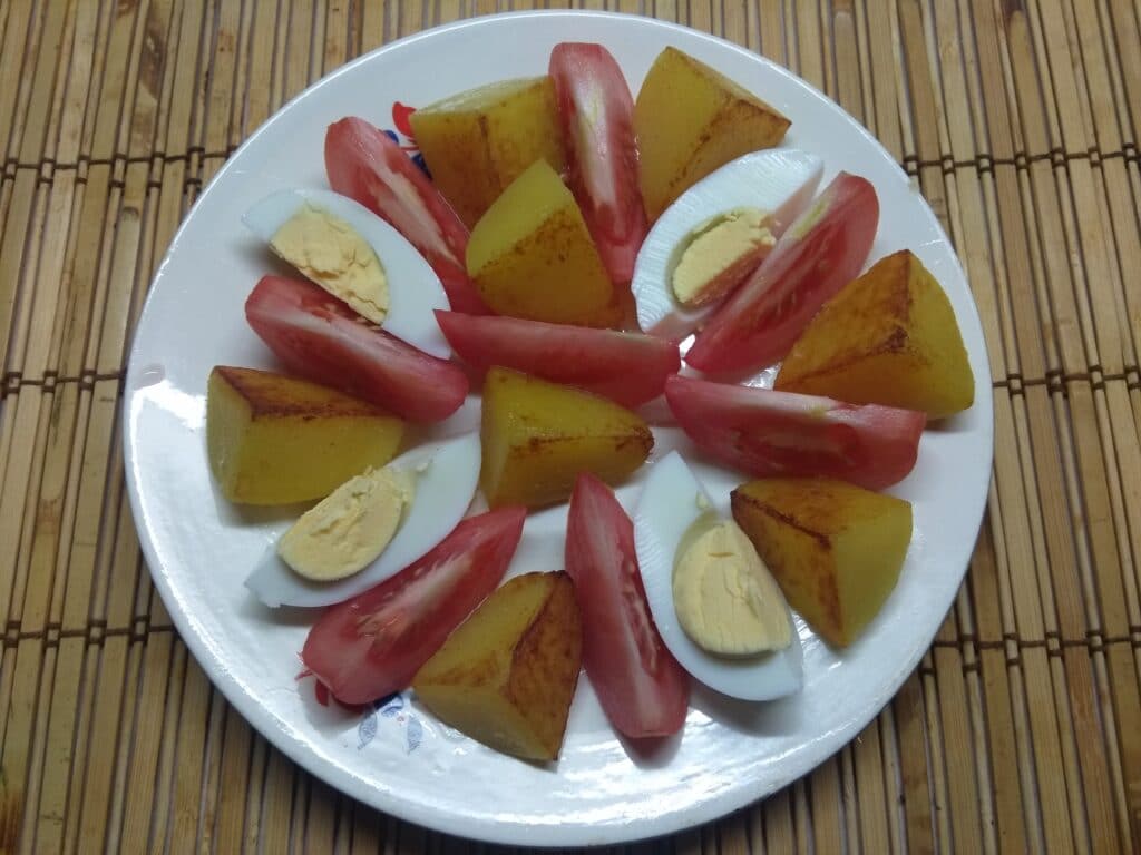 4. Яйцо отварить вкрутую, остудить, очистить и нарезать на 4 части. Выложить между кусками картофеля и помидора.