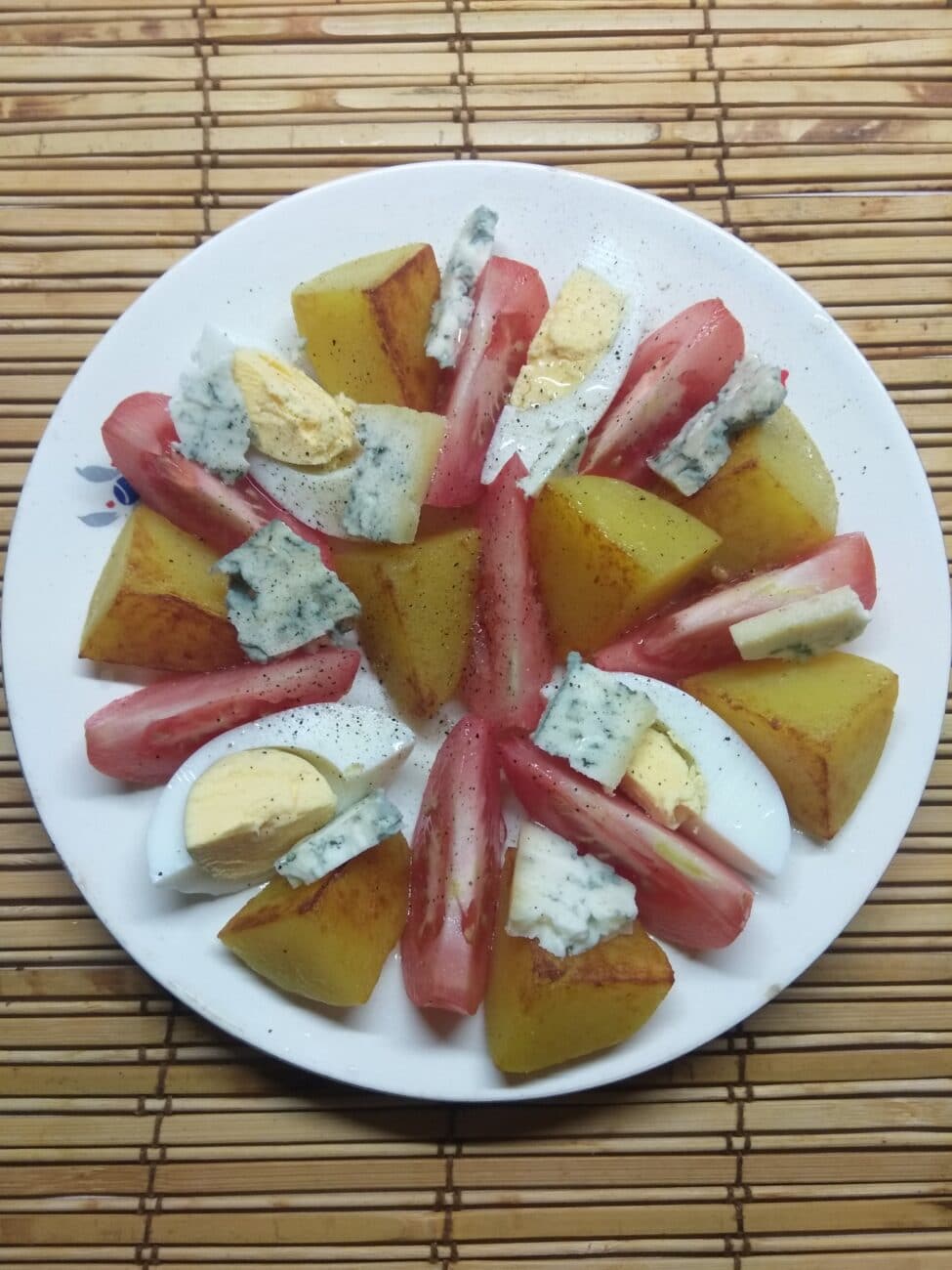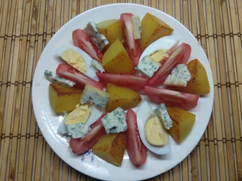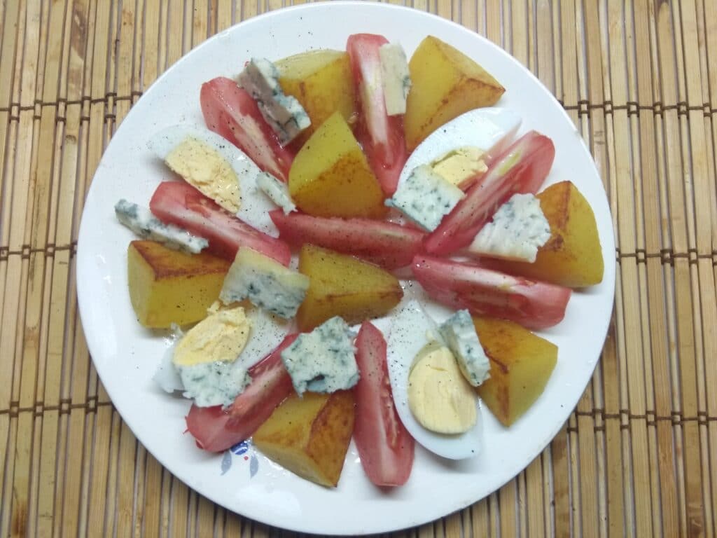 Салат с картофелем, отваренном в мундирах, свежими помидорами, варенными яйцами и пикантным и острым сыром Горгонзолла