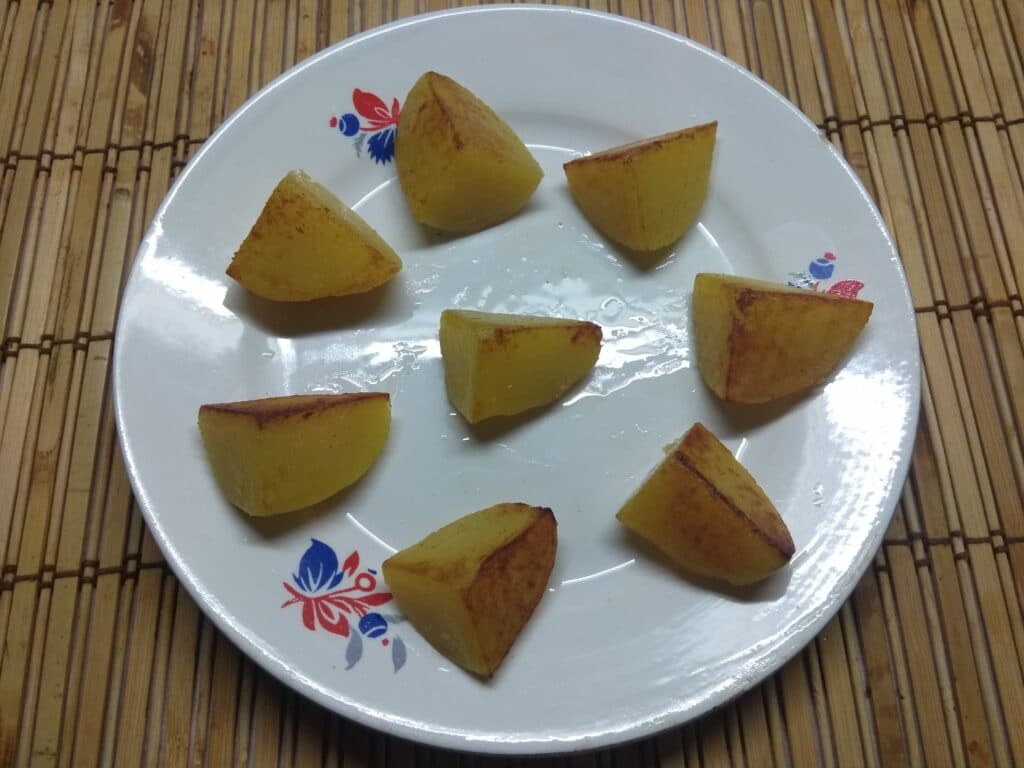 2. Нарезать крупными кусками и обжарить их на растительном масле до румяной корочки. Разложить по тарелке.