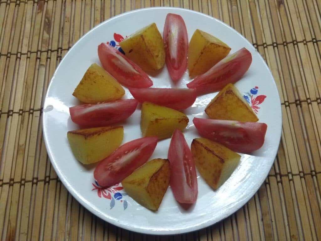 3. Помидор помыть, нарезать дольками, разложить между дольками картофеля