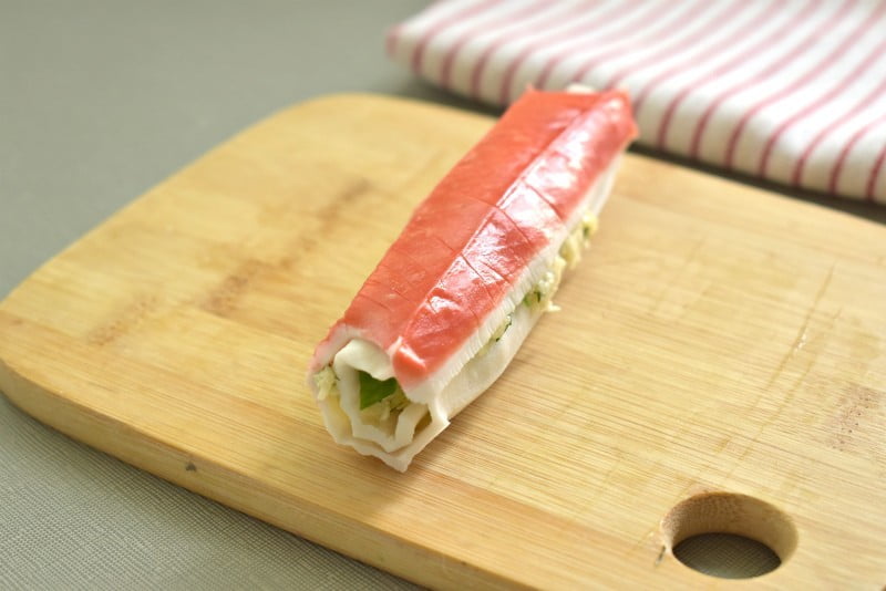 Промываем тщательно свежий огурец, нарезаем соломкой. 3-4 полоски огурца выкладываем на край смазанной крабовой палочки.