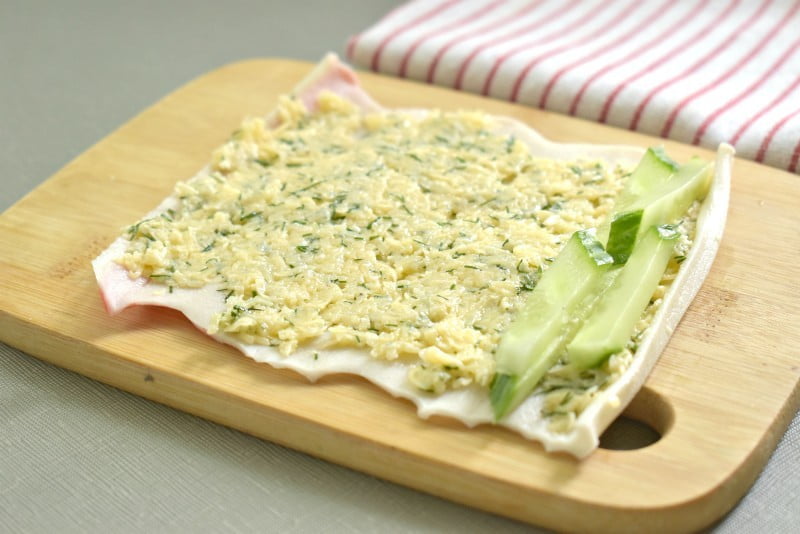 Для начинки сыр натираем средней теркой. Добавляем к сыру зубчик чеснока, пропущенный через пресс. Шинкуем укроп, тоже отправляем его в сырную стружку. Заправляем майонезом, перемешиваем. Выкладываем слоем на развернутую палочку.