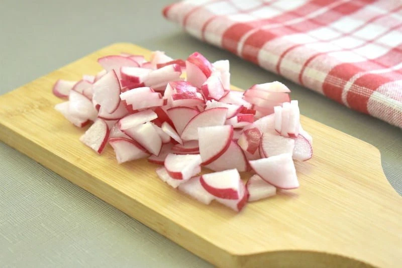 - Промываем тщательно редиску, срезаем хвостики. Нарезаем редис для салата тонкими колечками или четверть колечками.
