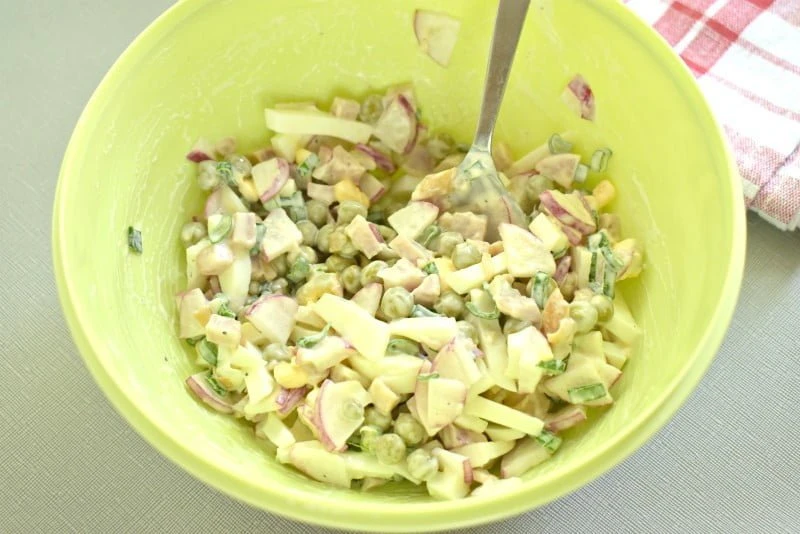 - Все ингредиенты соединяем вместе и заправляем майонезом. По вкусу солим и перчим. Перемешиваем.