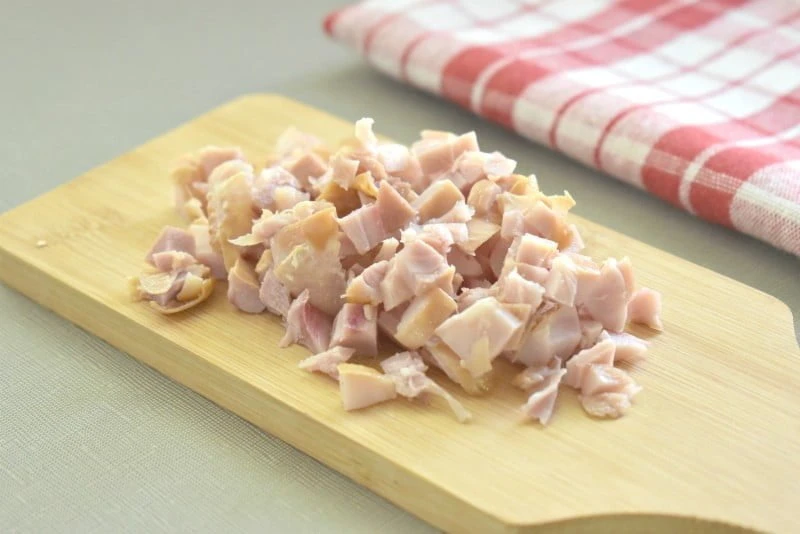 - Копченое куриное мясо нарезаем кубиками.