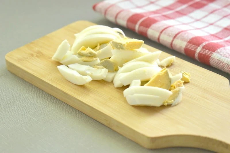 - Отварные куриные яйца нарезаем брусочками.