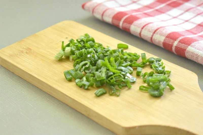 - Промываем перья зеленого лука, нарезаем колечками.