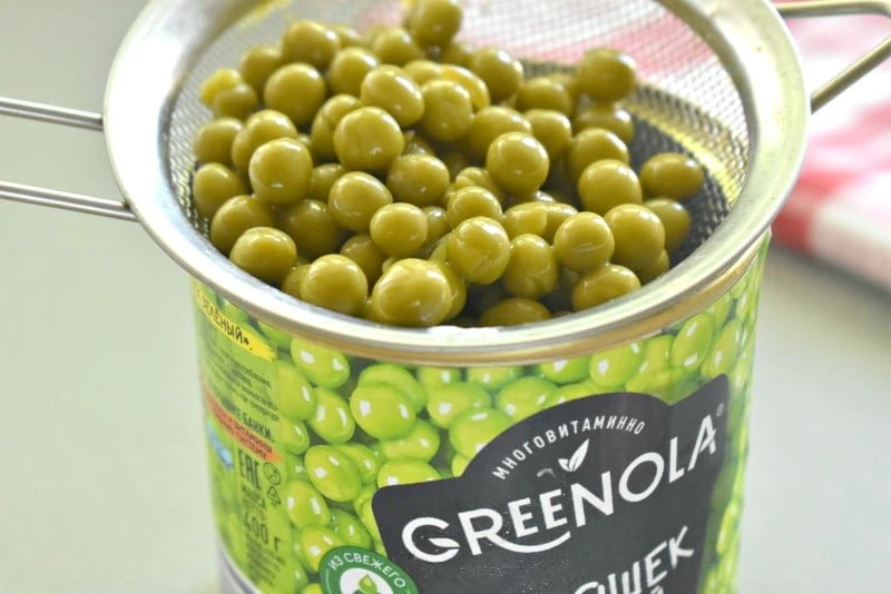 - Открываем баночку зеленого горошка. Выкладываем горошек в нужном количестве на сито, чтоб слить жидкость.