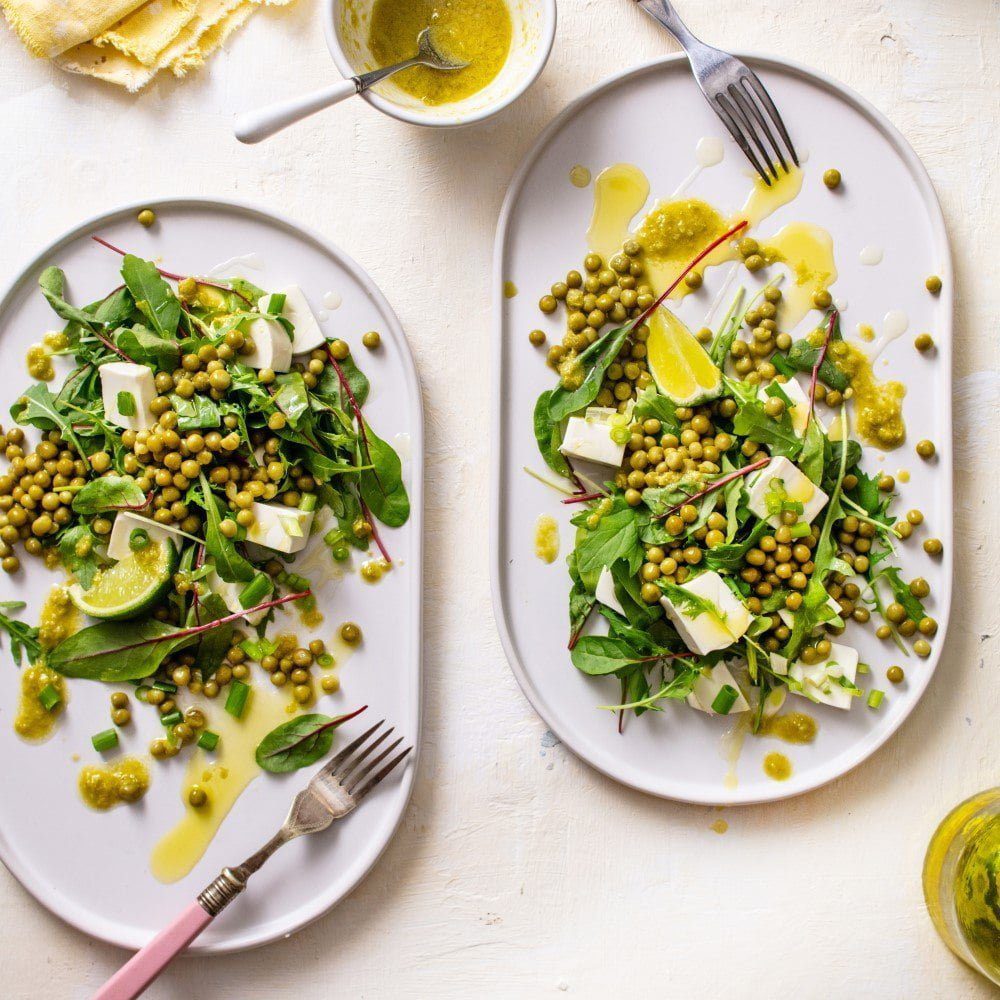 - Сыр фетаки порежьте кубиками, добавьте к сыру молодой горошек и листья салата.