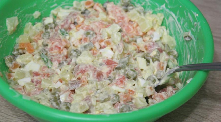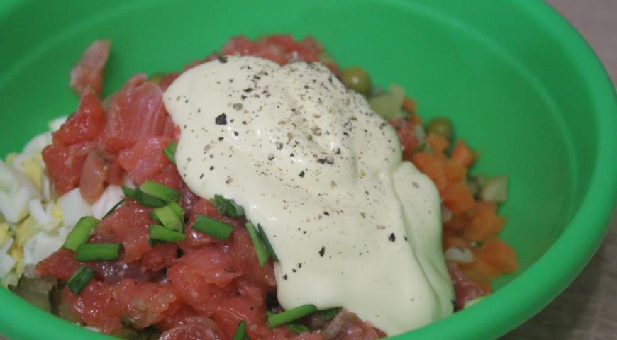 Добавить немного соли. Тщательно перемешать все ингредиенты салата оливье с семгой. Если рыба вам кажется солоноватой, откажитесь от соли, иначе вкус салата будет испорчен.