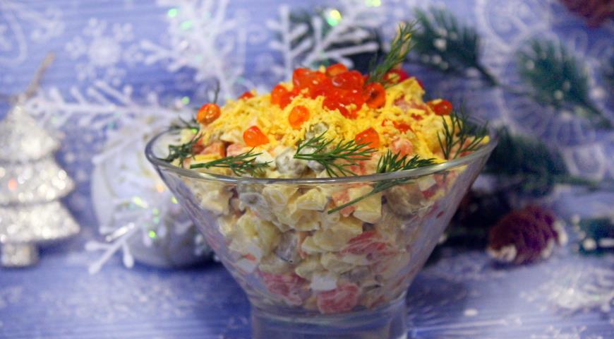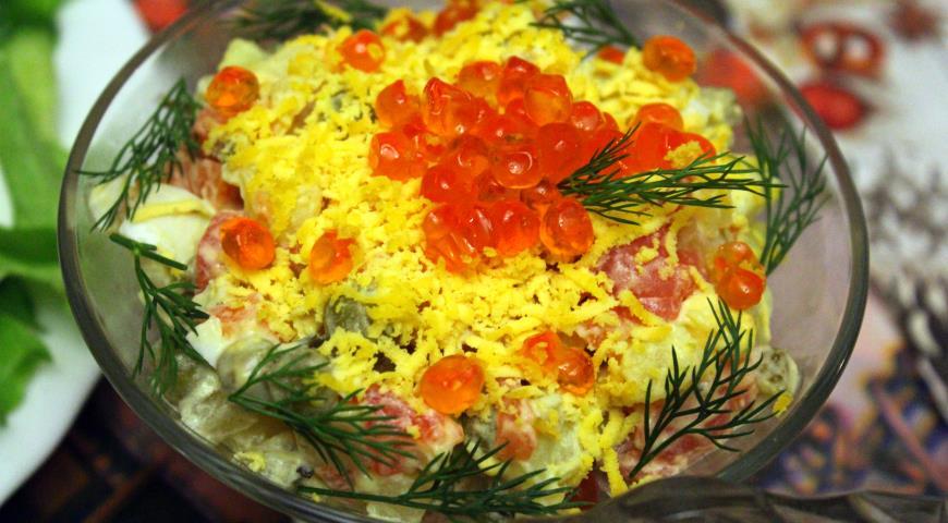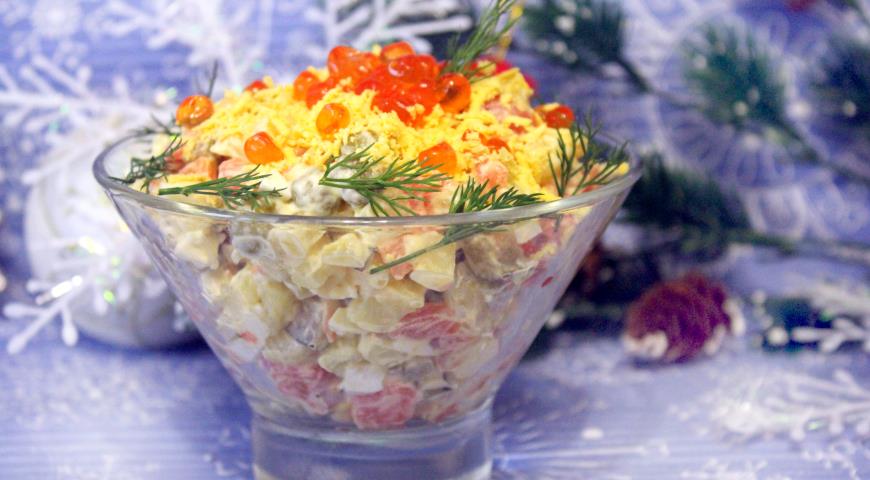 Даже если вы не употребляете мясо попробуйте приготовить оливье с семгой и икрой по нашему рецепту! С одной стороны, все основные составляющие этого популярного салата на месте, а с другой — с семгой он «звучит» совсем иначе. Слабосоленая семга делает вкус этого популярного салата удивительно нежным, обволакивающим и даже уютным. В итоге салат выходит настолько хорош, что у него есть все шансы войти в топ-лист ваших любимых домашних праздничных блюд! Ну а если дополнить оливье с семгой свежей по-настоящему вкусной, солоноватой красной икрой, то угощение автоматически получит статус «для особого повода».