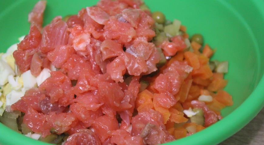 Маринованный огурец мелко нарезать и добавить к картофелю, моркови, яйцу и горошку в миске. Слабосоленую семгу нарезать маленькими кубиками. Добавить в миску к прочим ингредиентам оливье.
