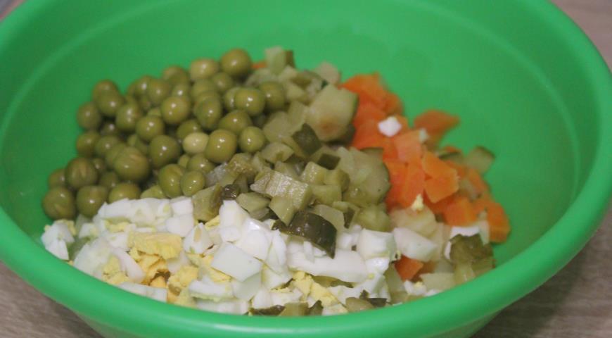 Картофель, морковь и яйцо для оливье после варки основательно охладить (лучше убрать на ночь в холодильник). Затем очистить и нарезать маленькими кубиками. Подготовленные ингредиенты оливье сложить в большую миску, добавить горошек.