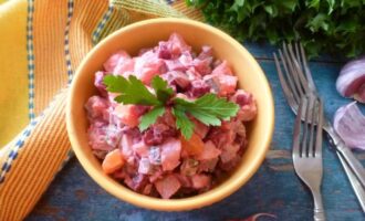 Добавить немного соли. Тщательно перемешать все ингредиенты салата оливье с семгой. Если рыба вам кажется солоноватой, откажитесь от соли, иначе вкус салата будет испорчен.