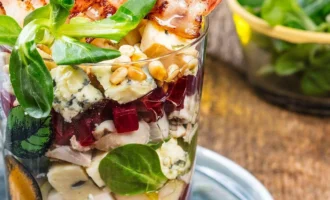 Оливье с семгой и икрой можно подать в порционном формате: в широких стаканах или на тарелочках, выложив в кулинарные кольца. Во втором случае вам потребуется время для охлаждения (1-2 часа), после чего кольца можно будет удалить.