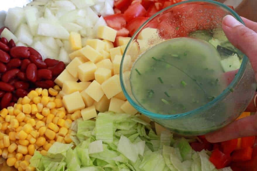 Простой салат из различных овощей с фасолью и кукурузой. А венец этому салату – сыр и ароматная заправка!