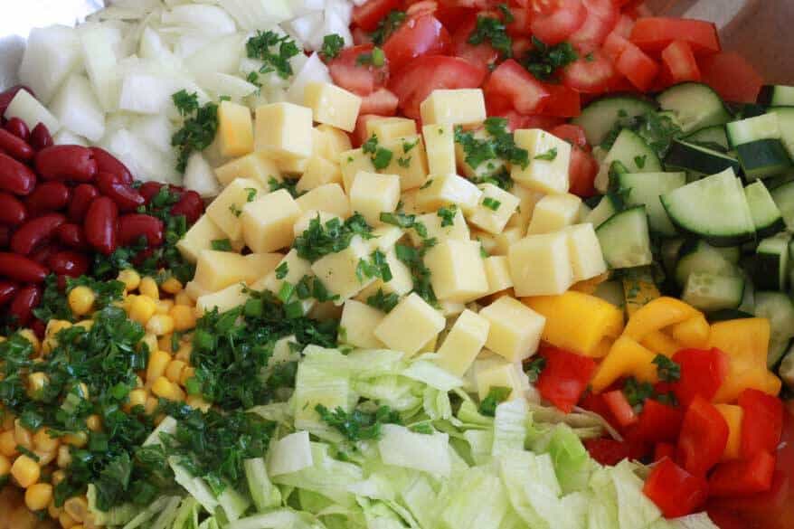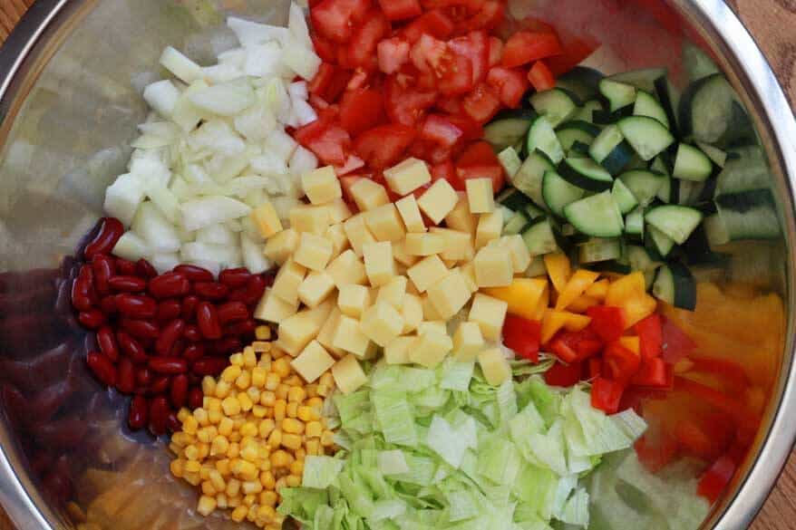 Смешайте предварительно нарезанные овощи, консервированные фасоль и кукурузу, сыр, нарезанный кусочками в большой миске.