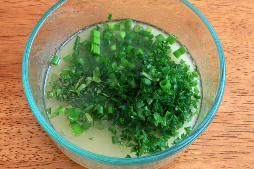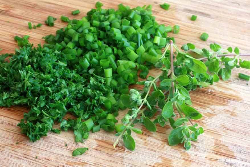 Нарежьте свежий зеленый лук, петрушку, подготовьте майоран.