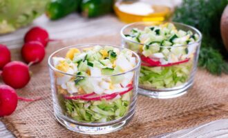 | 8 | Выложить салат на тарелке небольшой горкой. Обсыпать тертым сыром и тертым куриным желтком. |