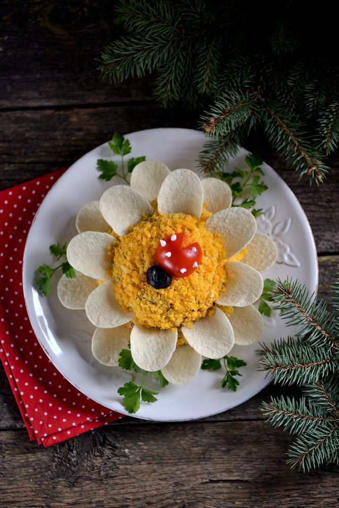 | 10 | Сверху украсим божьей коровкой и помидора. Наш праздничный салат полностью готов. |