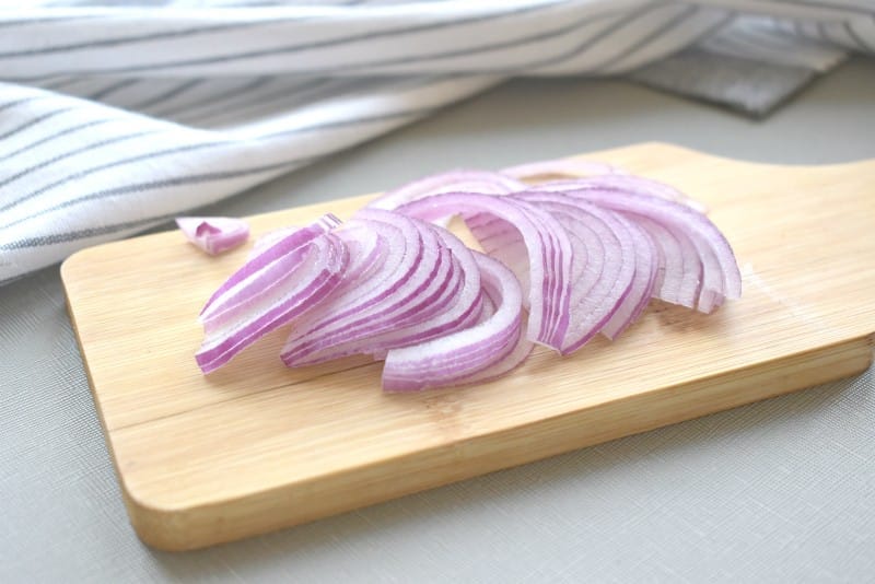 Очищаем фиолетовый лук и шинкуем его тонкими полукольцами.