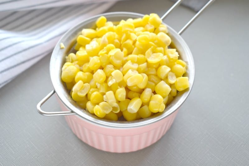 Открываем баночку кукурузы. Зёрна откидываем на дуршлаг, чтобы слить лишнюю жидкость.