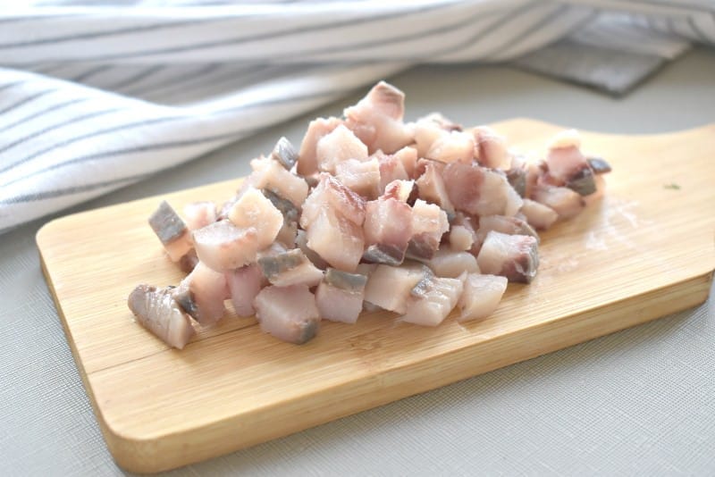 Филе солёной или малосолёной сельди нарезаем небольшими кубиками.