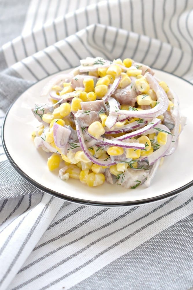 Рыбный салат с сельдью и кукурузой — это восхитительное блюдо, которое объединяет сочное мясо сельди, ароматный и слегка сладкий вкус кукурузы, а также лук и зелень.