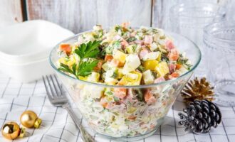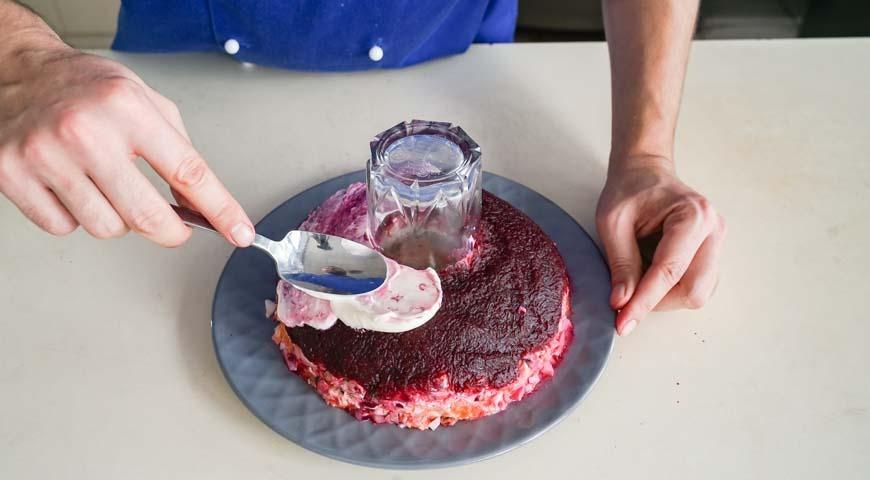 Следующий слой – свекла, она должна закрыть салат со всех сторон. Немного посолите, поперчите и смажьте майонезом.