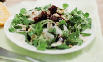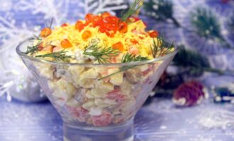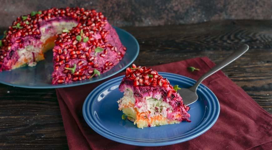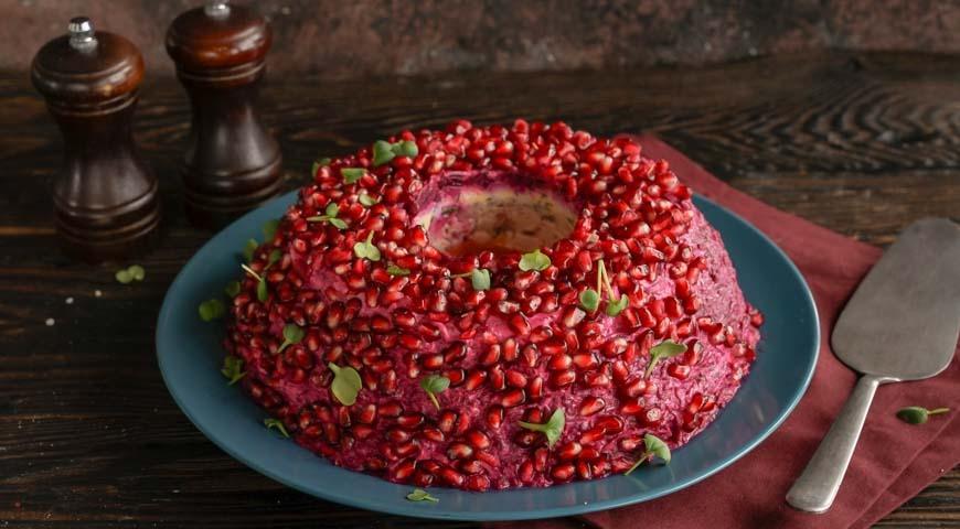 Хорошо утрамбуйте салат, накройте пищевой пленкой и уберите в холодильник на 3 ч. Затем аккуратно выньте стакан. Плотно покройте всю поверхность салата гранатом и снова уберите в холодильник на 3 ч. Полезный совет