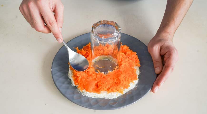 Второй слой – морковь. Немного посолите, поперчите и смажьте майонезом.
