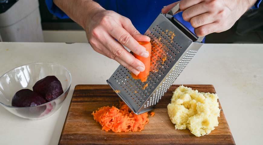 Для салата гранатовый браслет с курицей отварите свеклу, морковь и картофель по отдельности в кипящей подсоленной воде до готовности или приготовьте на пару. Остудите, очистите. Натрите овощи на мелкой терке.