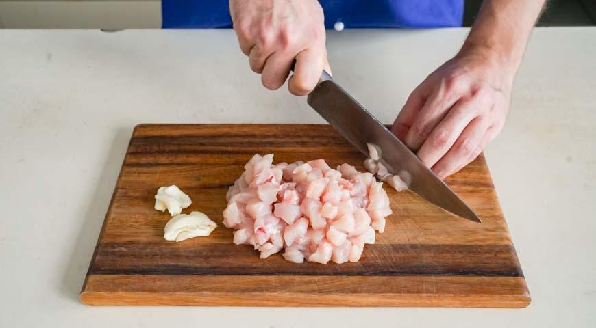 Куриное филе нарежьте маленькими кубиками. Чеснок раздавите ножом и очистите. Добавьте его в разогретую сковороду с оливковым маслом и жарьте 1 мин. до появления аромата.