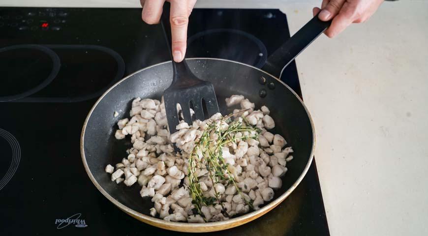 Положите в сковороду куриное мясо и тимьян и жарьте на сильном огне, помешивая, до готовности, 5 мин. Снимите с огня и остудите. Удалите чеснок и веточки тимьяна.