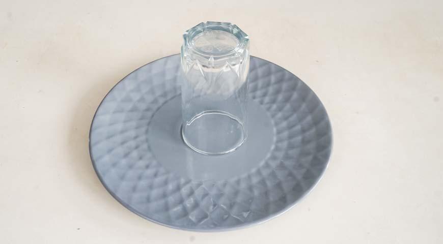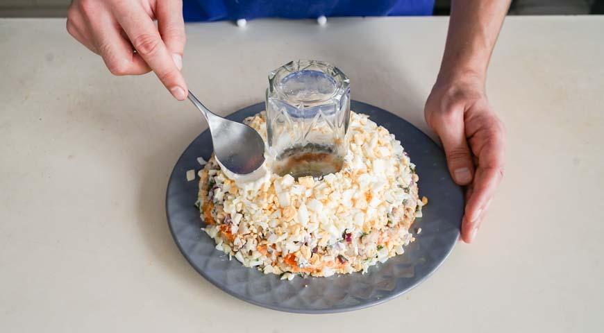 В центр блюда поставьте стакан. Салат гранатовый браслет с курицей выкладывается слоями по кругу.