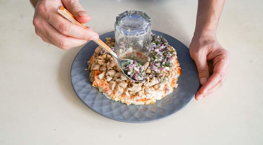 Третий слой – курица, на нее выложите лук и укроп. Немного посолите, поперчите и смажьте майонезом.