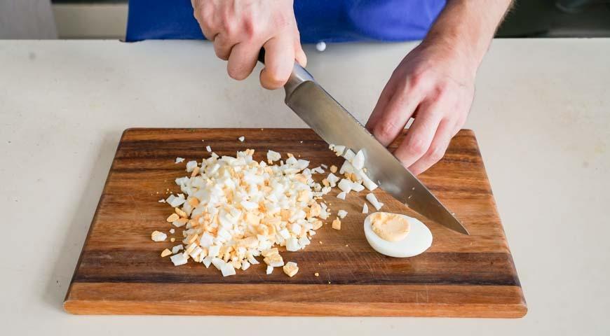Сварите яйца вкрутую, остудите, очистите. Мелко нарежьте.