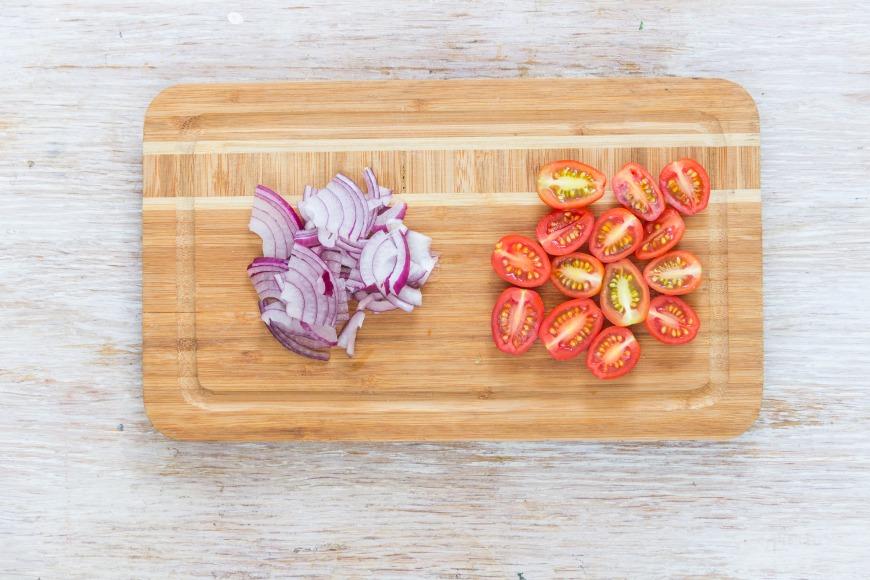 Помидоры черри разрежьте пополам, лук нарежьте тонкими полукольцами. Смешайте все ингредиенты в большой миске.