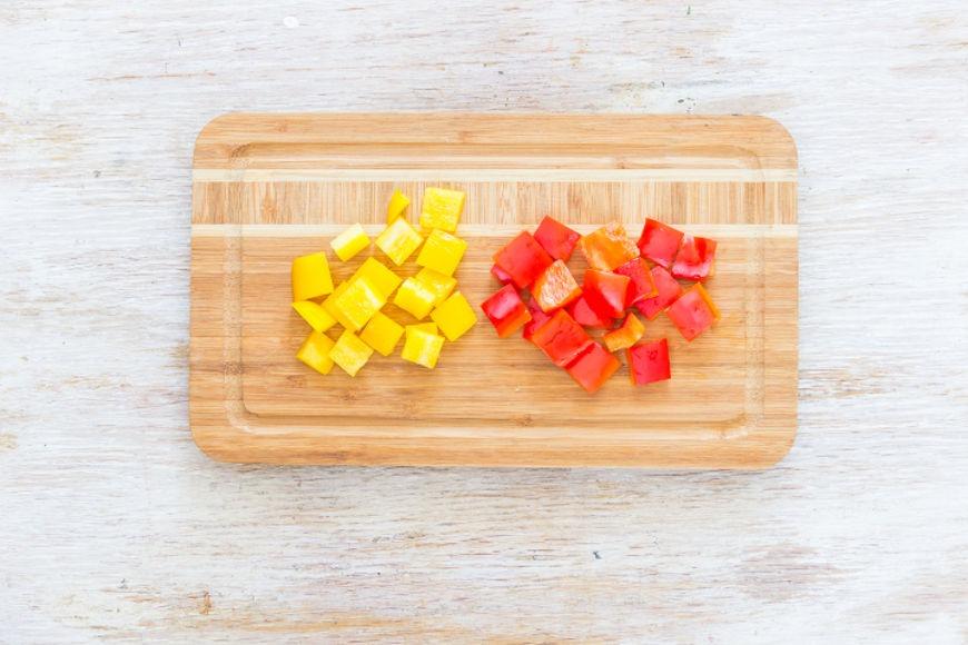 Огурцы разрежьте пополам, вырежьте семена и нарежьте ломтиками толщиной 5-6 мм. Перец нарежьте квадратами со стороной 1.5 см.