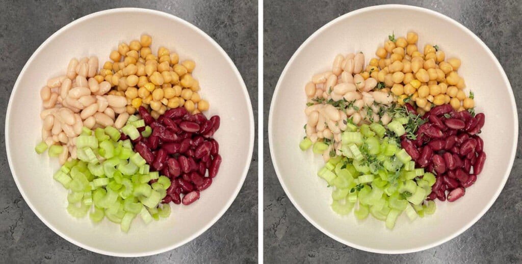 Выложите фасоль и горох нут в салатник. Добавьте сельдерей, нарезанный ломтиками примерно по 2 см.