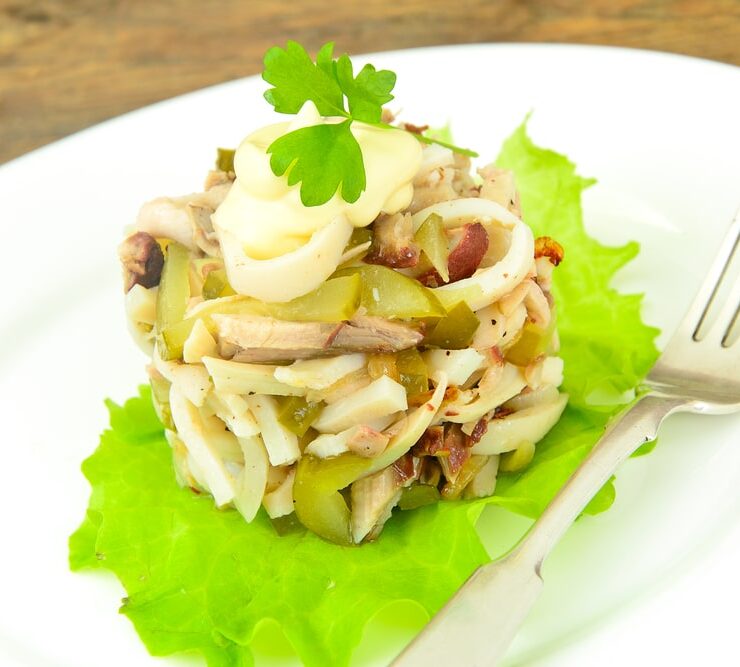 🥗 Салат из кальмаров с жареной курицей и маринованными огурцами