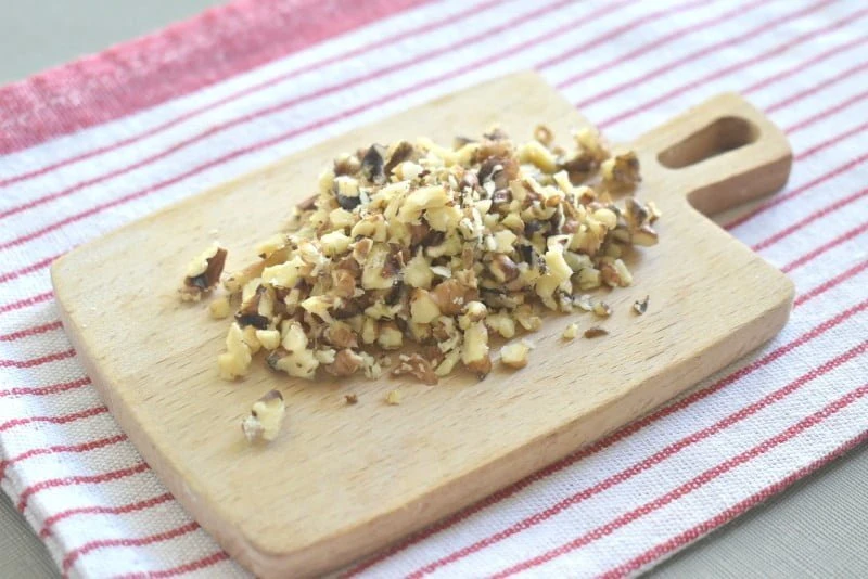 - По необходимости подсушиваем на горячей сухой сковороде грецкие орехи. Затем мелко рубим их кусочками.