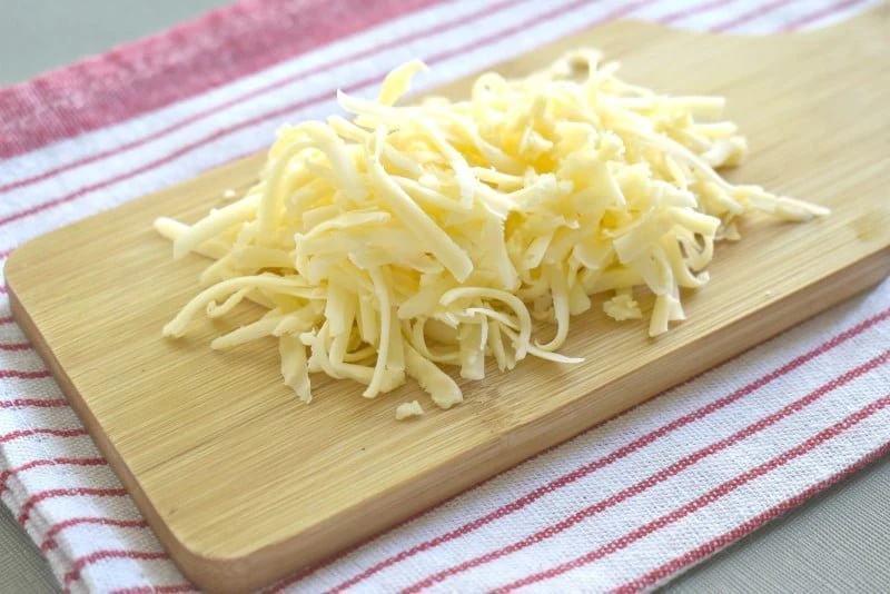 - Сыр твёрдых сортов измельчаем с помощью крупной тёрки. Сырную стружку перекладываем в салатник.