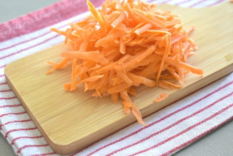 - Очищаем морковку, натираем её и добавляем к остальным ингредиентам салата.