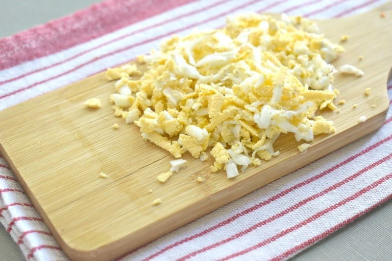 - Заранее отвариваем куриные яйца (на готовку уйдёт примерно 12 минут с момента закипания воды). Яйца остужаем под ледяной водой и очищаем. Для нашего салата яйца тоже крупно натираем.
