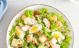 Заправьте салат взбитой вилкой заправкой. Дайте постоять 5 мин. и подавайте.