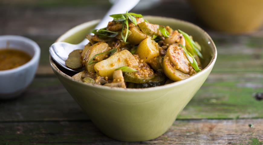 Разрежьте огурцы вдоль пополам или на четвертинки, затем нарежьте тонкими ломтиками. Измельчите зеленый лук. Смешайте теплые грибы и зеленый лук, затем добавьте картофель и огурчики.