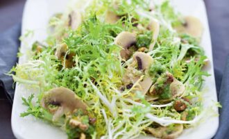 4. На тарелки выложите свёклу и орехи. Сверху полейте соусом и выложите лепестки сыра. Перед подачей украсьте шапкой из салатных листьев.