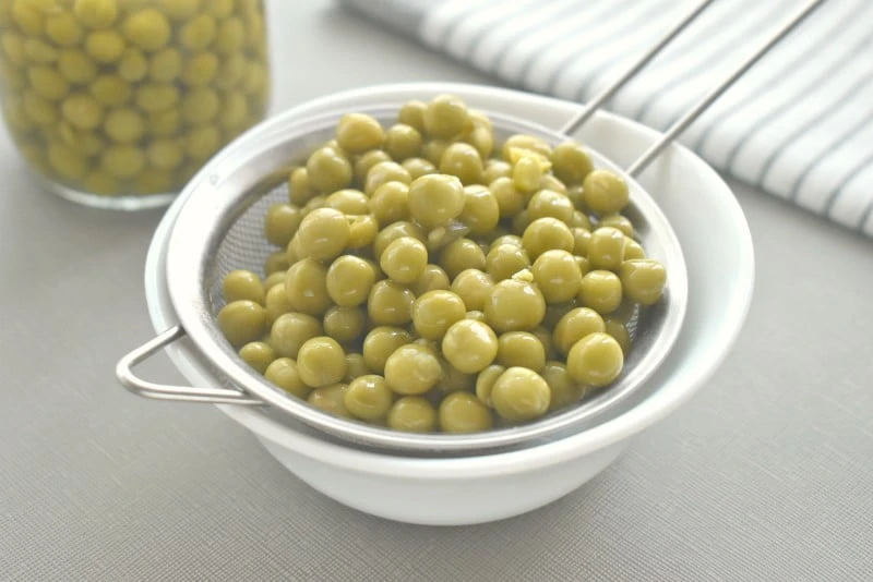 - Нам осталось дополнить наш салат ещё зелёным консервированным горошком. Но сначала откидываем его на сито, чтобы слить лишнюю жидкость.