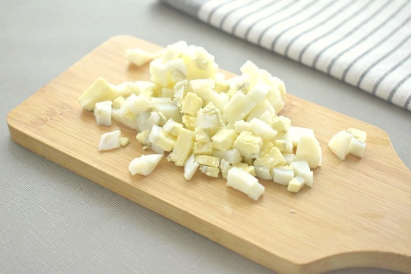 - Отварные яйца шинкуем кусочками, добавляем в состав салата.